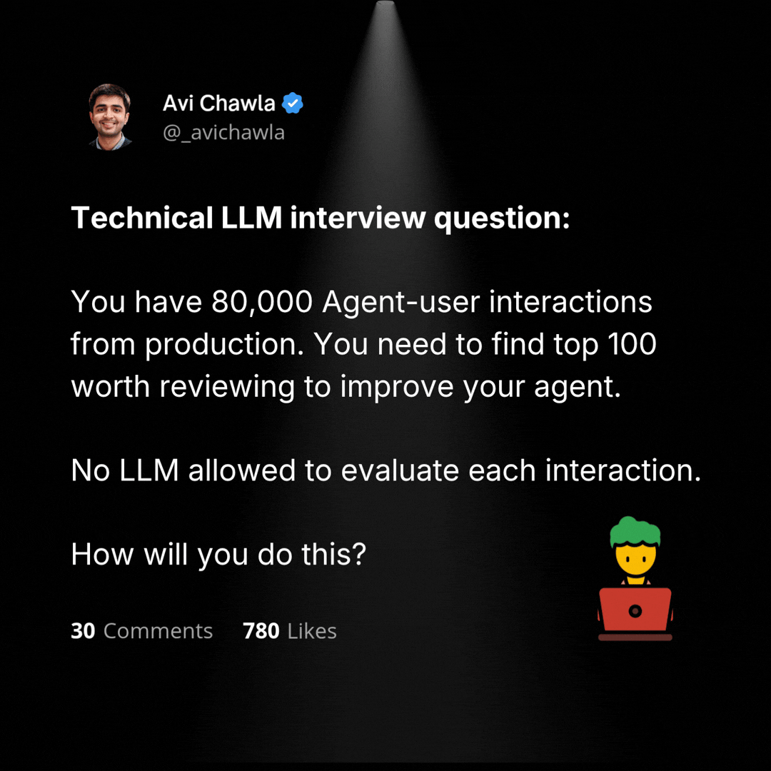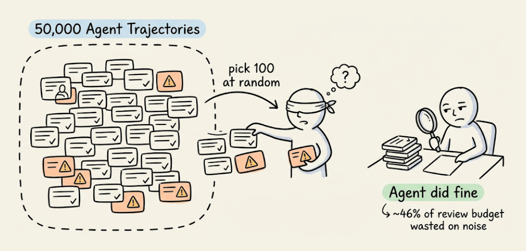 You have 80,000 agent trajectories from production. You need to find top 100 worth reviewing to improve your agent.
