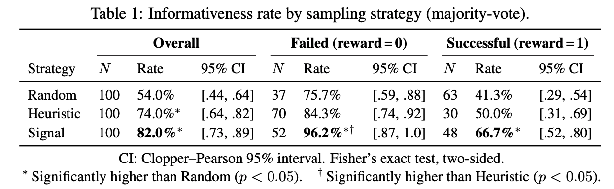 In fact, among conversations where the agent completed the task correctly, signal sampling still identified useful patterns in 66.7% of cases vs. 41.3% for random.