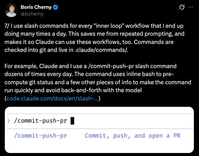 This is the same pattern Boris Cherny described in his thread on Claude Code workflows, where his every repeated workflow becomes a command, checked into Git, and shared with the team: