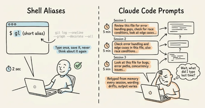 With Claude Code prompts, though, devs typically skip this step entirely and keep retyping the same 10-15 line instructions from memory, like their code review checklist, test gen constraints, pre-commit scan...and all this session after session.
