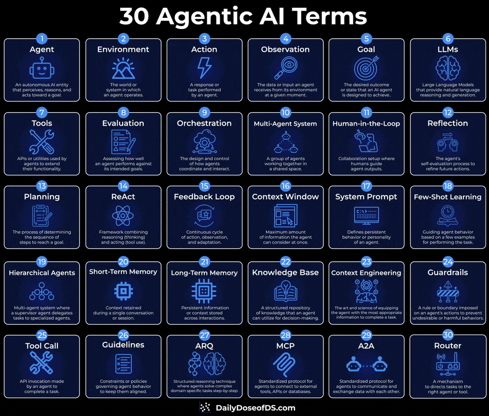 We just put together a quick visual guide to the 30 most important terms in Agentic AI, covering some of the most essential things you need to understand about how modern AI agents actually think, act, and collaborate.