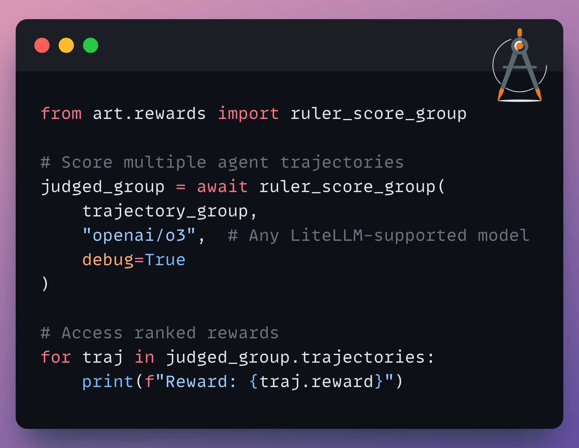 RULER from OpenPipe (open-source) takes a different approach. Instead of scoring each trajectory in isolation, it asks an LLM judge to rank multiple trajectories against each other.