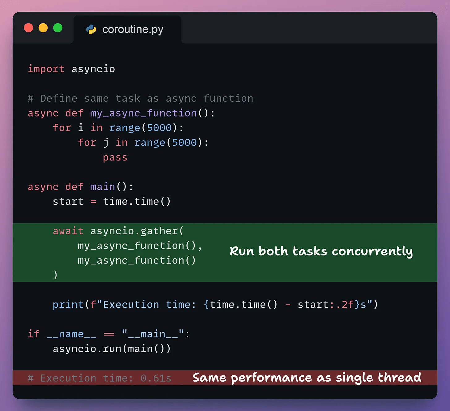 Coroutines shine when waiting on external resources, like APIs, databases, and file systems. But for pure computation, there’s no advantage.