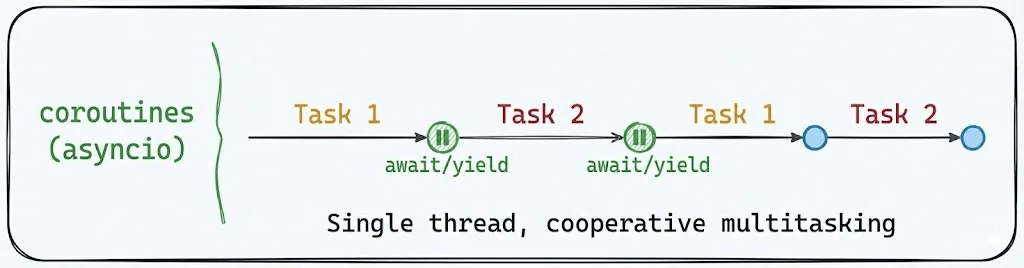 Note: Coroutines enable concurrency (handling multiple tasks) but not parallelism (executing simultaneously). We include them because developers often confuse the two.
