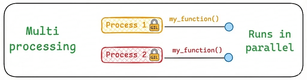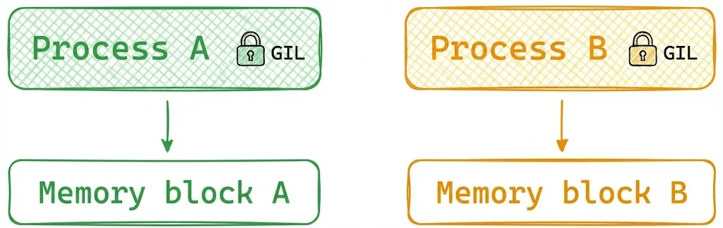 Each process has its own memory space and its own GIL. This isolation enables true parallel execution on different CPU cores.