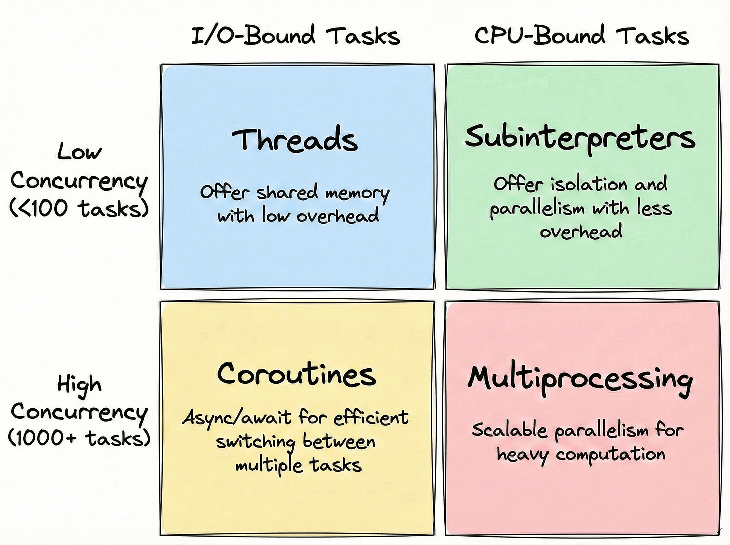 Solid comparison of Python parallelism options. The subinterpreter section is particularly timely with 3.14 approaching. One nuance worth mentioning is memory overhead with multiprocessing can become brutal when dealing wtih large dataframes. We've had to switch back to threads with GIL-free Python 3.13 for some workloads where process creation overhead killed performance gains.