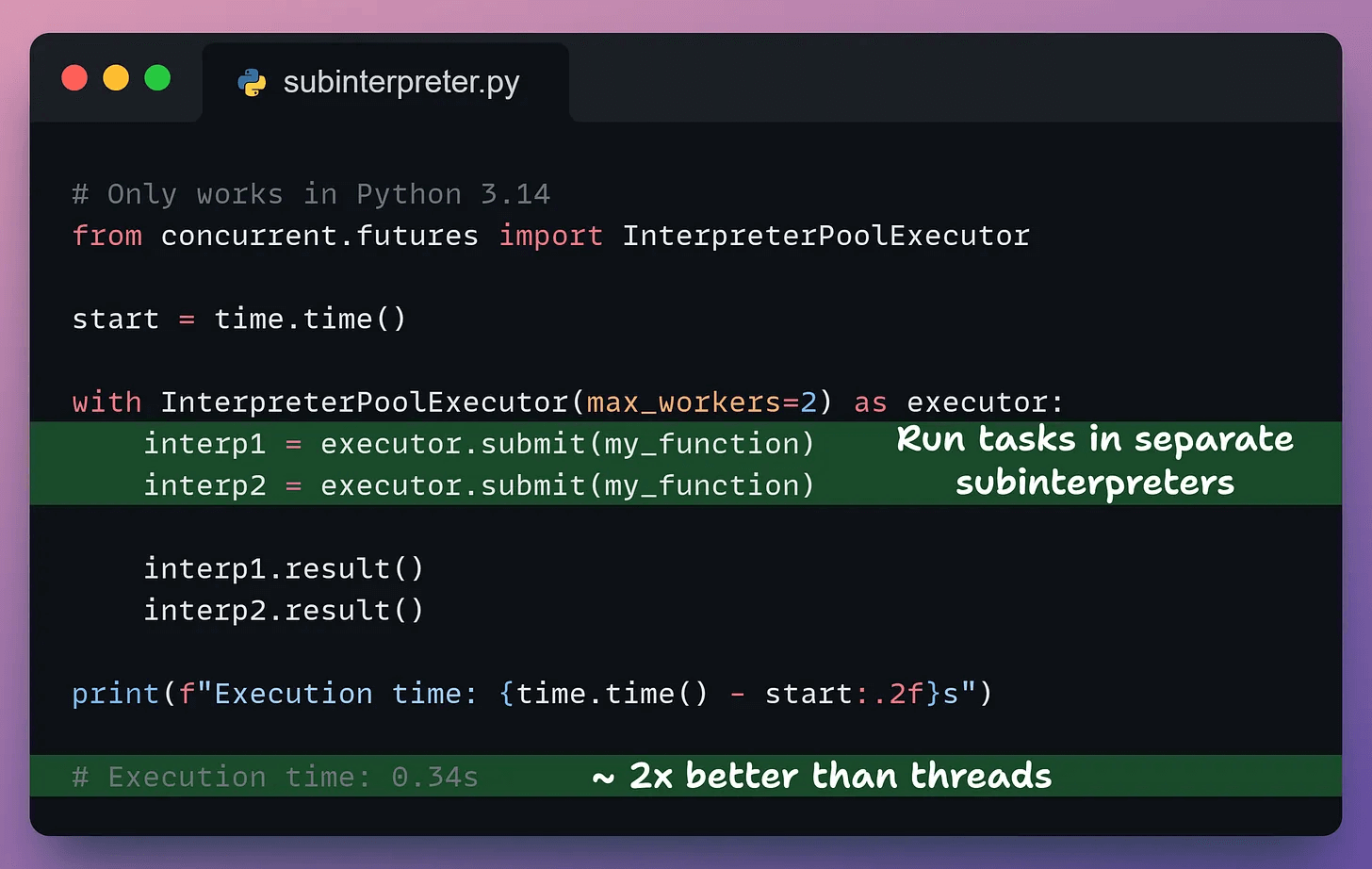 InterpreterPoolExecutorAPI requires Python 3.14 for the promised performance gains. Earlier implementations (3.12, 3.13) don’t achieve true parallel speedup. Subinterpreters remain experimental and aren’t yet recommended for production.