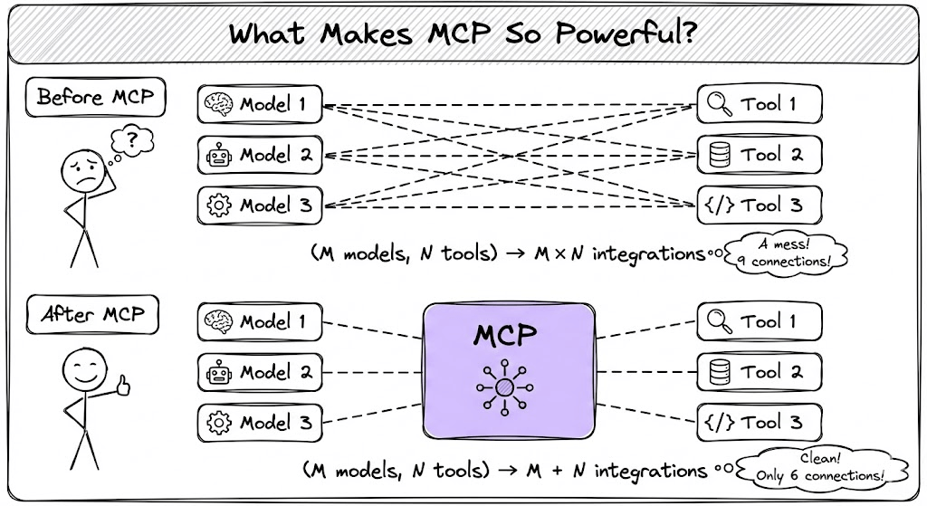 Traditional tool integration requires N×M connections. If you have 3 models and 4 tools, you need 12 integration points.