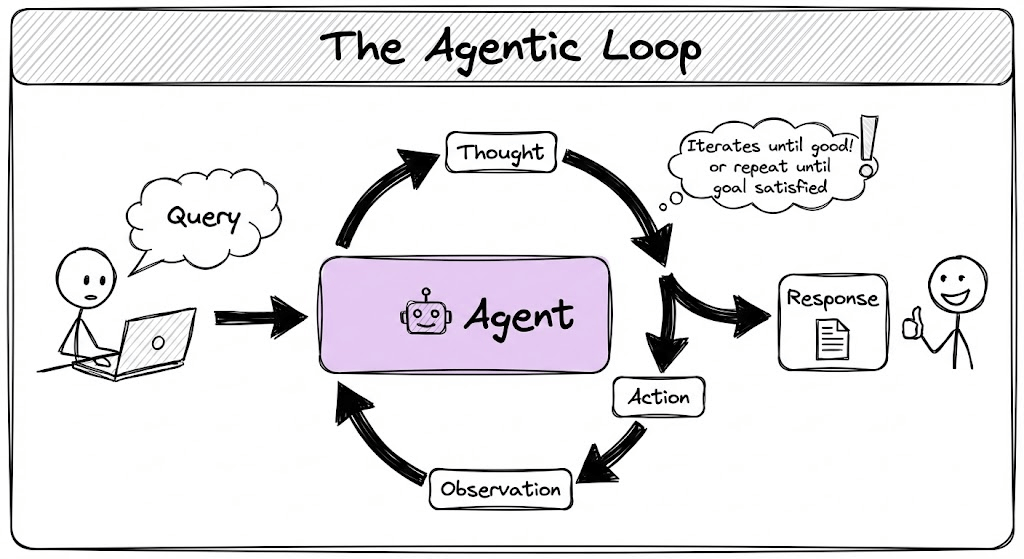 The basic loop looks like this: Query → Thought → Action → Observation → (repeat until goal satisfied) → Response