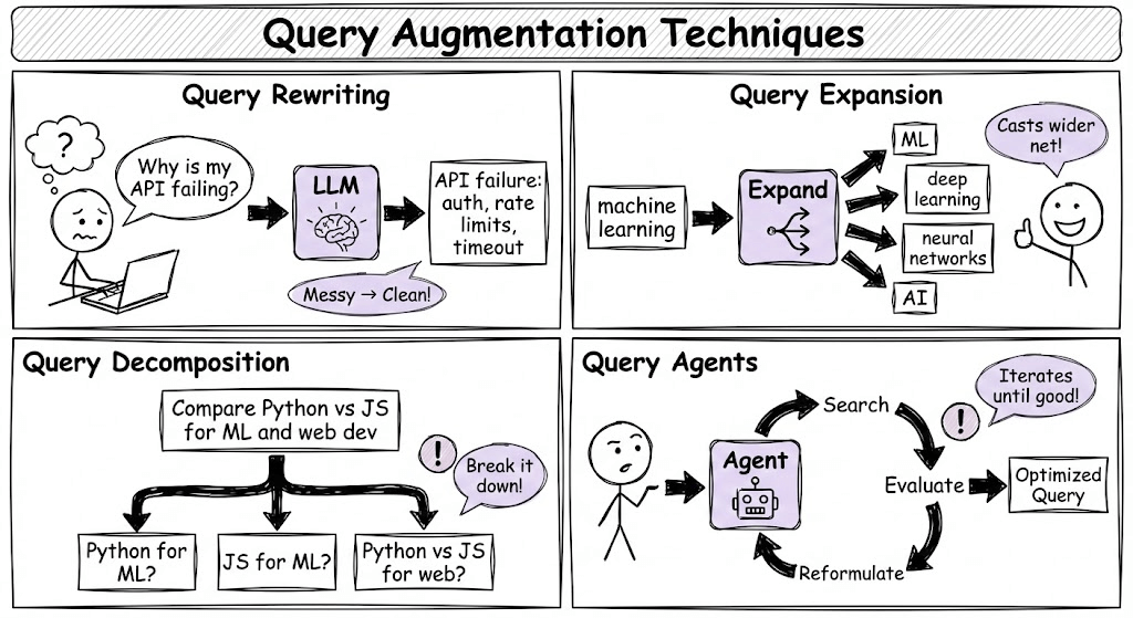 Query Expansion: Adding related terms and synonyms to cast a wider net.