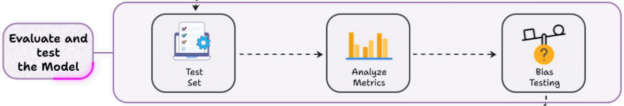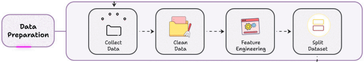 Here, you collect your data, clean it (handle missing values, outliers, inconsistencies), engineer meaningful features, and split it properly into train/validation/test sets.