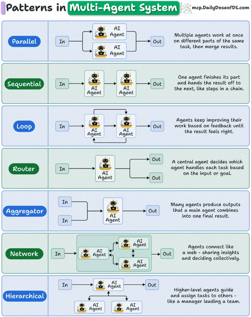 This visual explains the 7 core patterns of multi-agent orchestration, each suited for specific workflows: