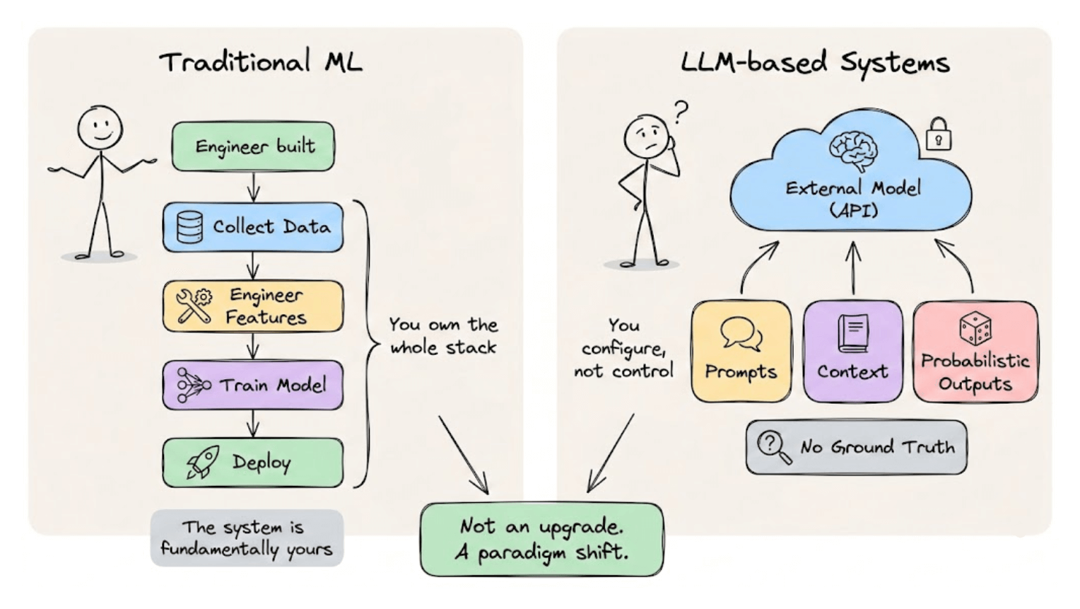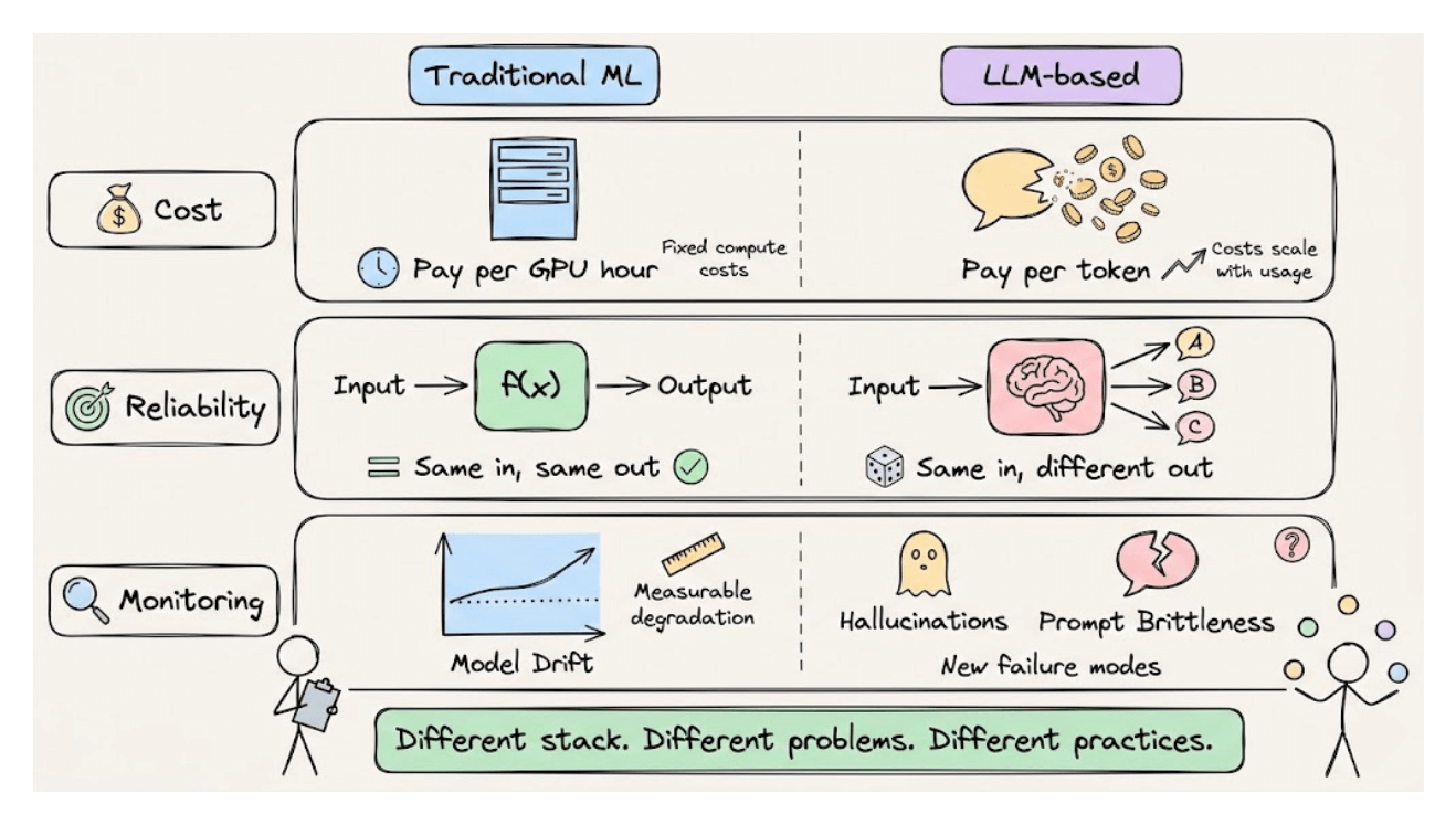 The transition from traditional ML to LLM-based systems is often framed as an upgrade, but it’s more accurate to call it a paradigm shift.