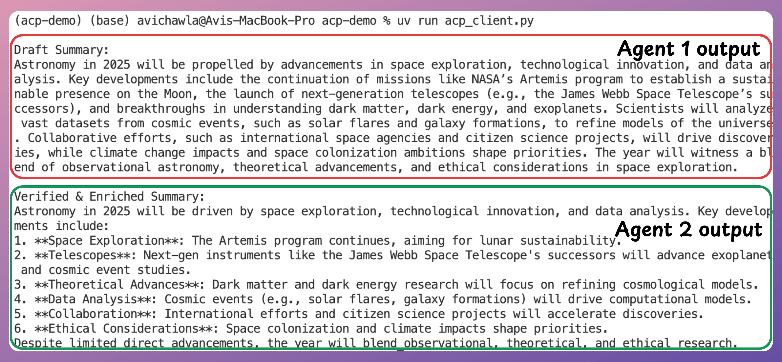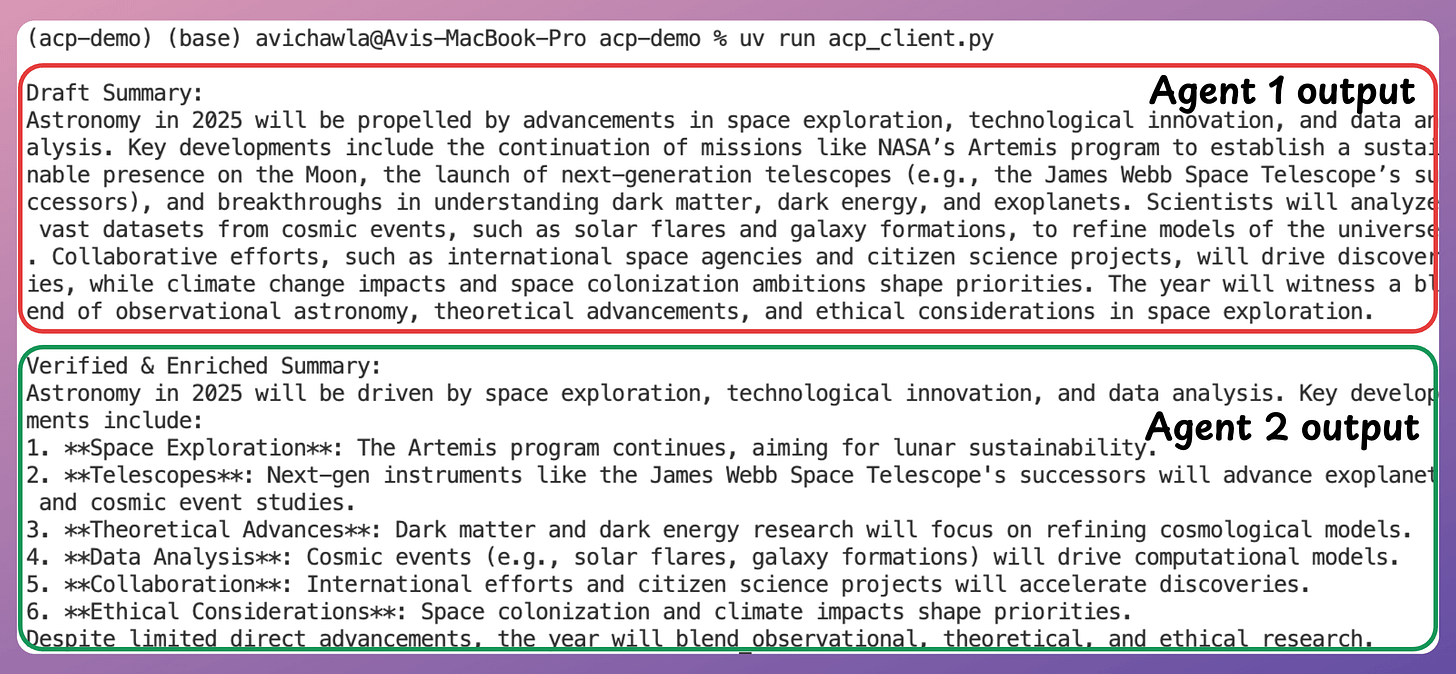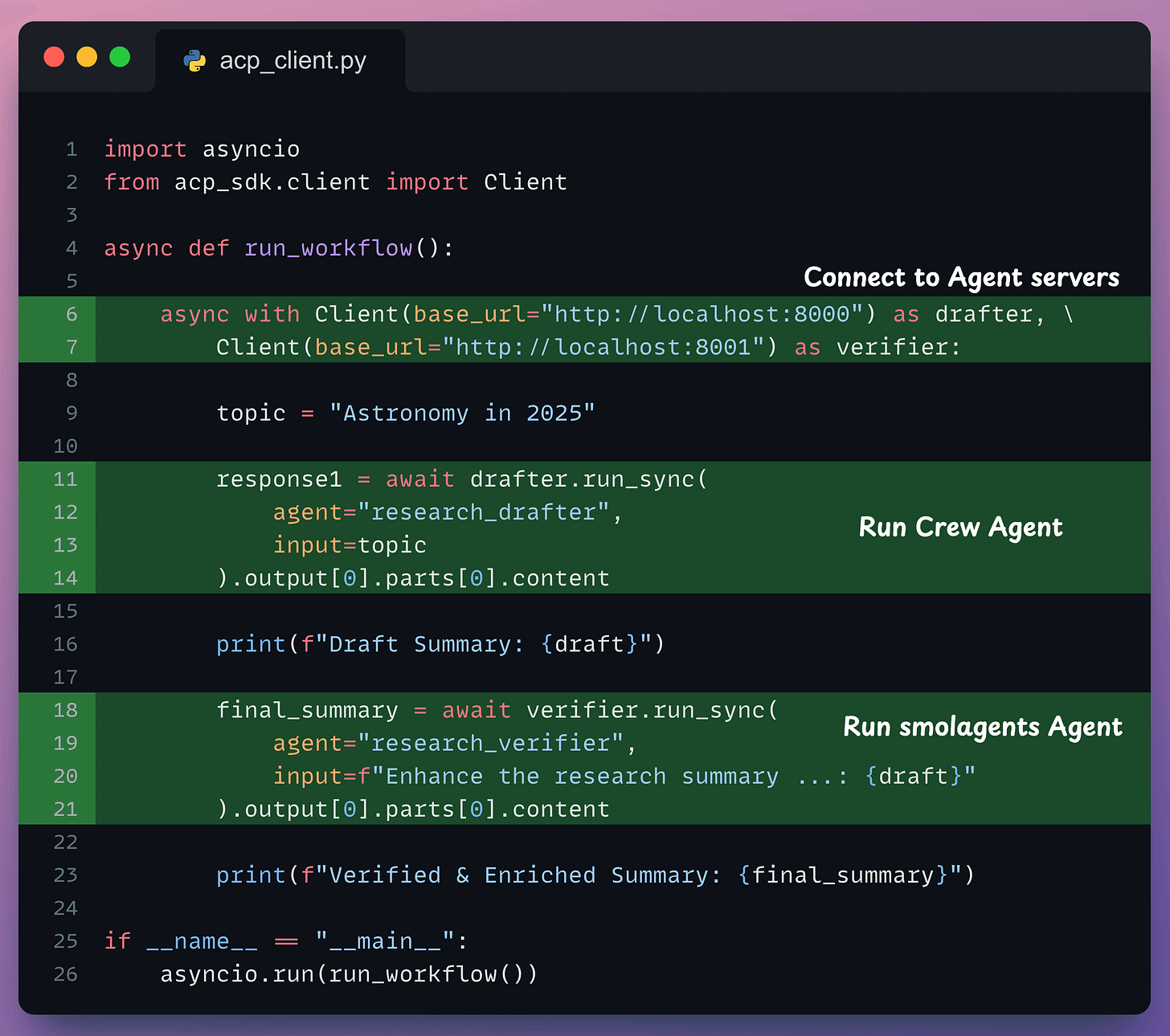 Finally, we use an ACP client to connect both agents in a simple workflow.