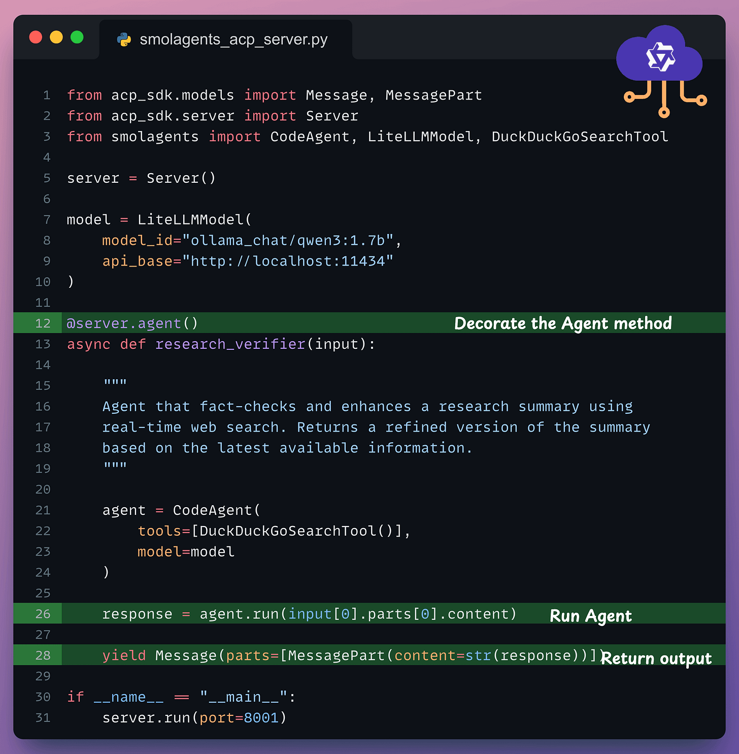 Line 2 → Declare the method with an input parameter. Note that the name of this function would be used as the agent name for discovery via ACP.