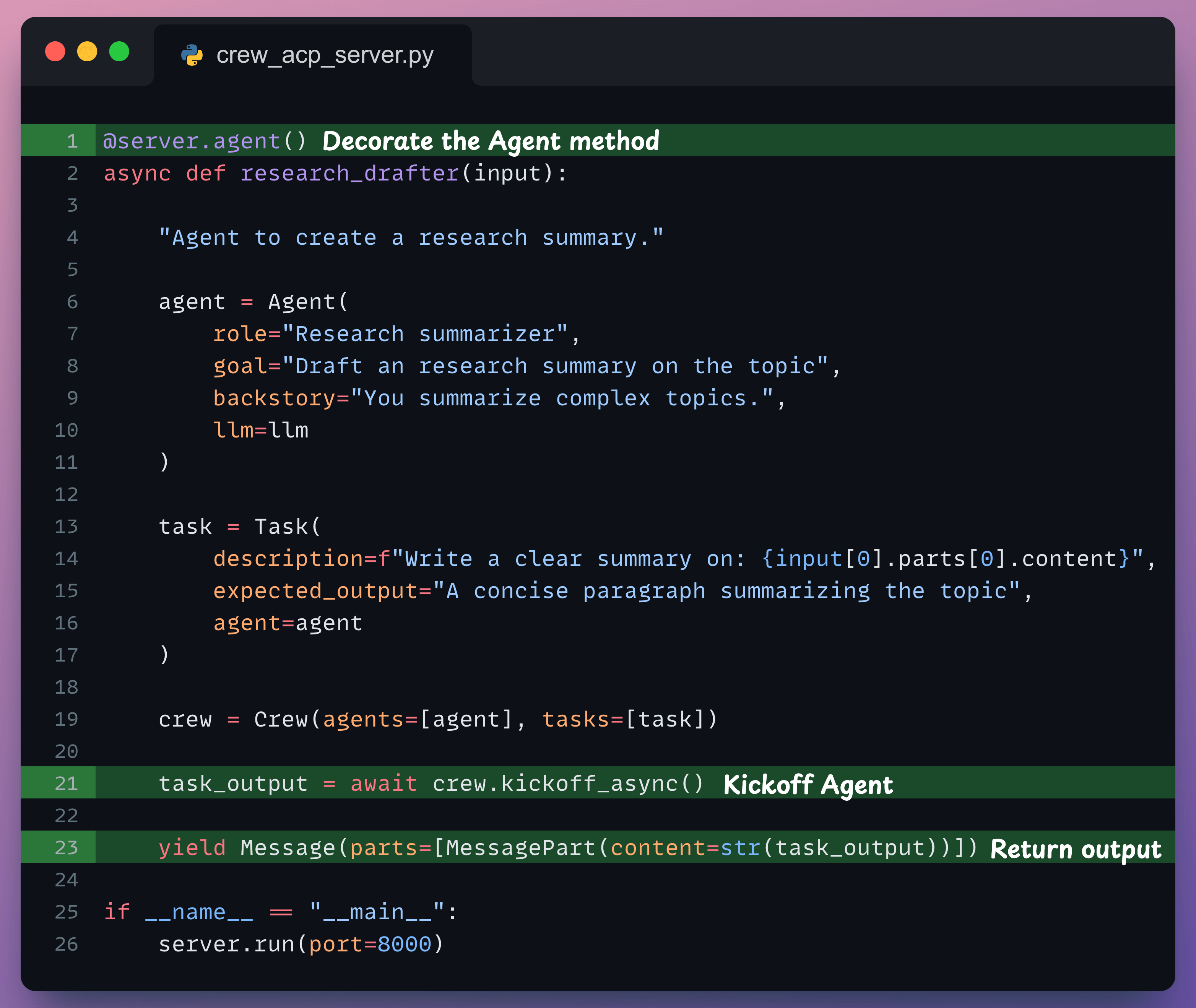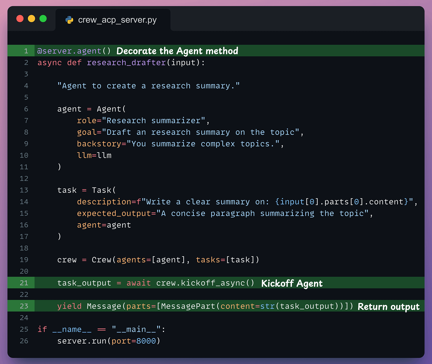 In ACP, your Agent should be enclosed within a method decorated with the @server.agent() decorator.