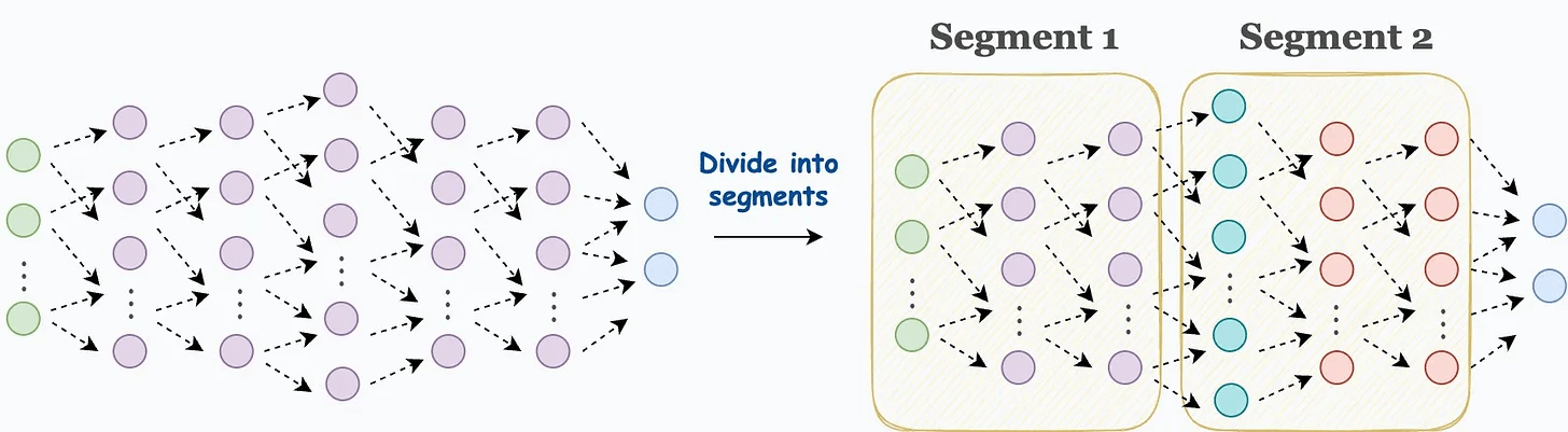 For instance, as shown in the image below, to update the weights of the red layers, we recompute their activations using the activations of the cyan layer, which are already available in memory.