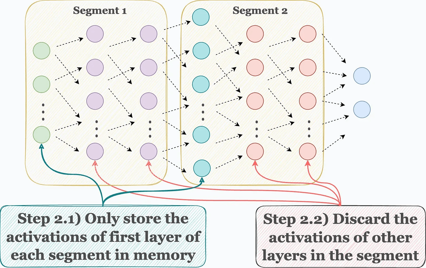 Step 2) During forward pass, store the activations of the first layer only in each segment. Discard the rest when they have been used to compute the activations of their subsequent layer.