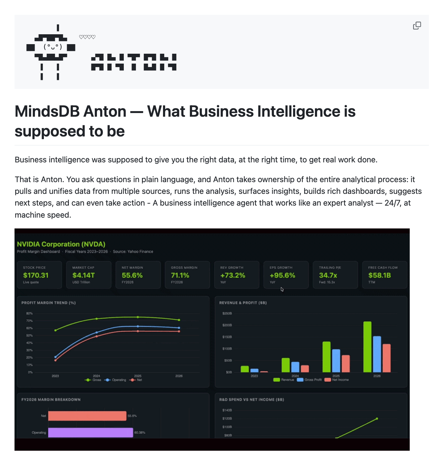You ask something like “Show me NVIDIA’s profit margins,” and Anton handles everything: figuring out the right data source, writing and executing the code, computing the metrics, and generating interactive visualizations.