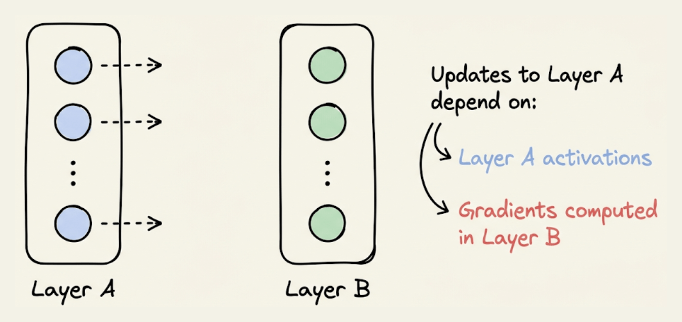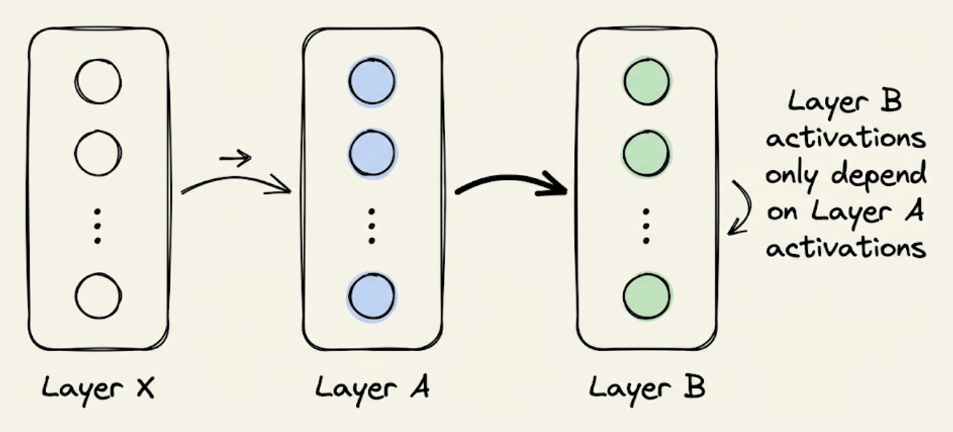 The activations of a specific layer can be solely computed using the activations of the previous layer. For instance, in the image below, “Layer B” activations can be computed from “Layer A” activations only: