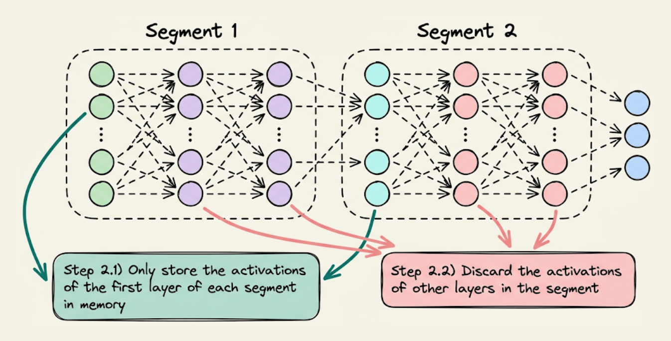 Step 2) During forward pass, store the activations of the first layer only in each segment. Discard the rest when they have been used to compute the activations of their subsequent layer.