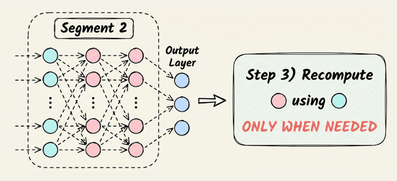 For instance, as shown in the image below, to update the weights of the red layers, we recompute their activations using the activations of the cyan layer, which are already available in memory.