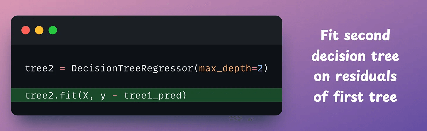 Now, to construct the next tree, we fit another model on the residuals (true-predicted) of the first tree: