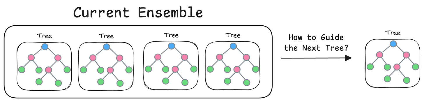How to construct the next tree based on the current trees → The variable here is the loss function. This guides the model on how to focus the next tree to correct the errors of the previous ones.