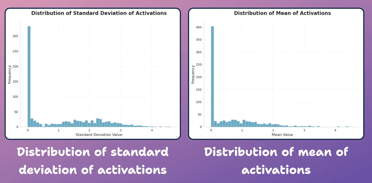 As depicted below, most neurons’ average activations and their std dev. are heavily distributed around near-zero values.