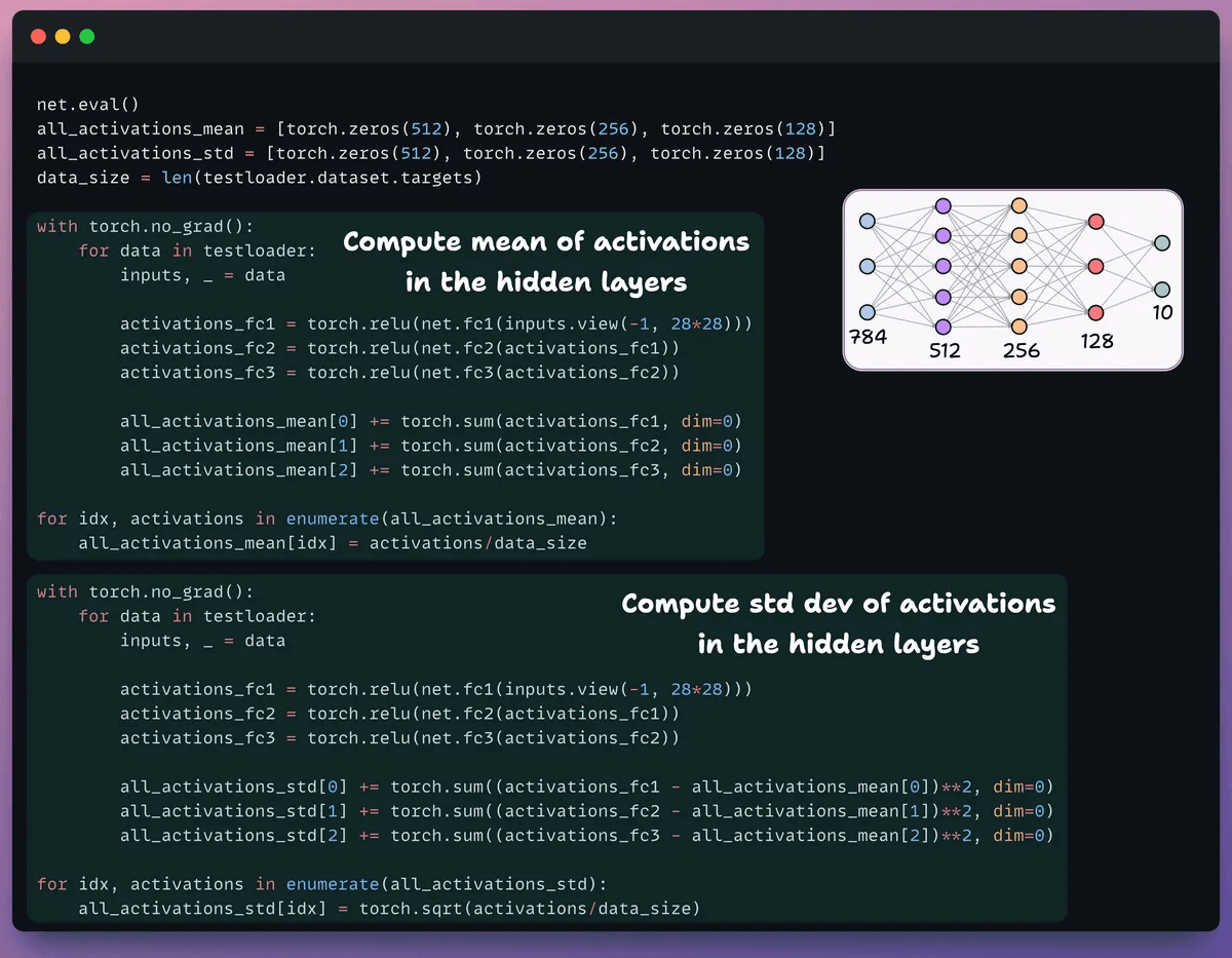 We pass the validation set through our model to compute these stats for each hidden layer.