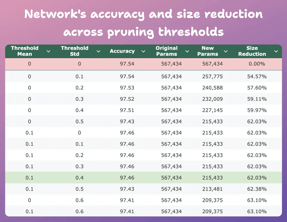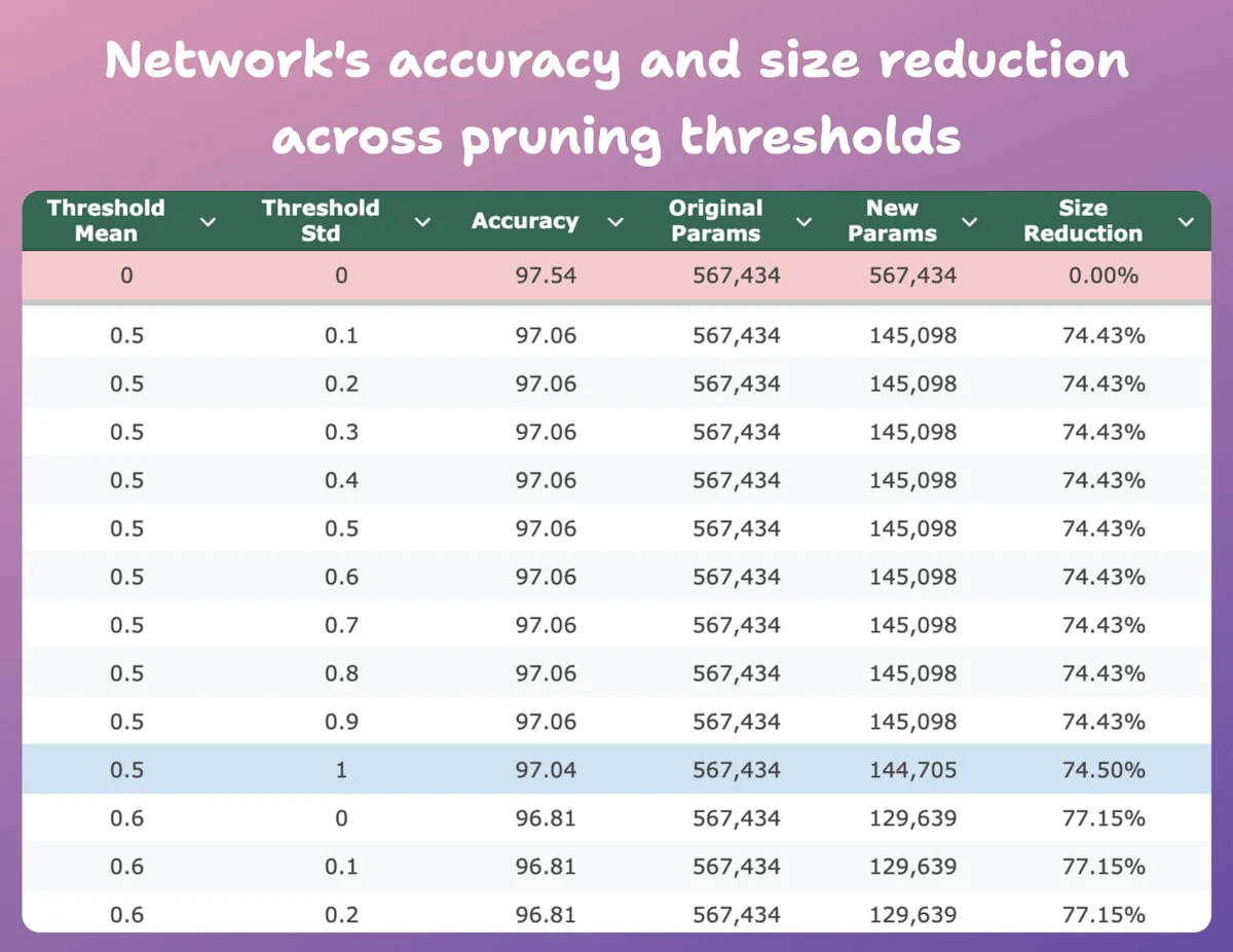 This table compares the pruned model’s accuracy and size reduction across several thresholds relative to the original model.