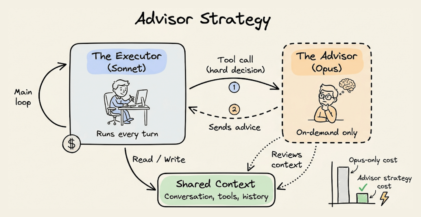 Yesterday, Anthropic shipped an “advisor tool” in the Claude API that lets Sonnet or Haiku consult Opus mid-task, only when the executor needs help.