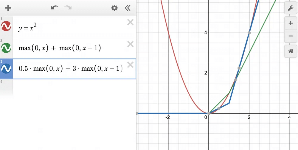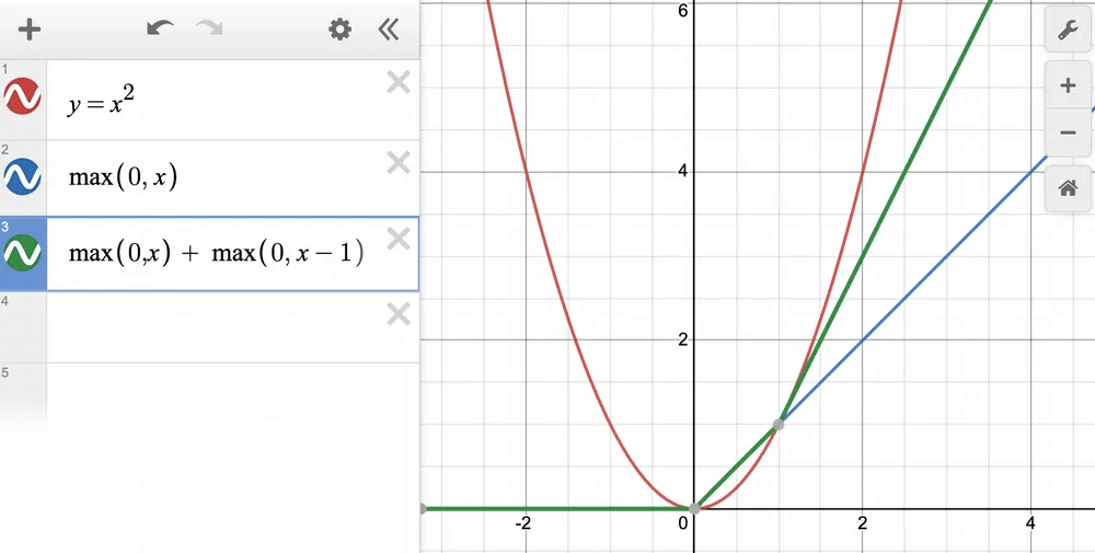 Next, we add another ReLU term and plot ReLU(x) + ReLU(x−1), which produces the green line below and it is a better approximation: