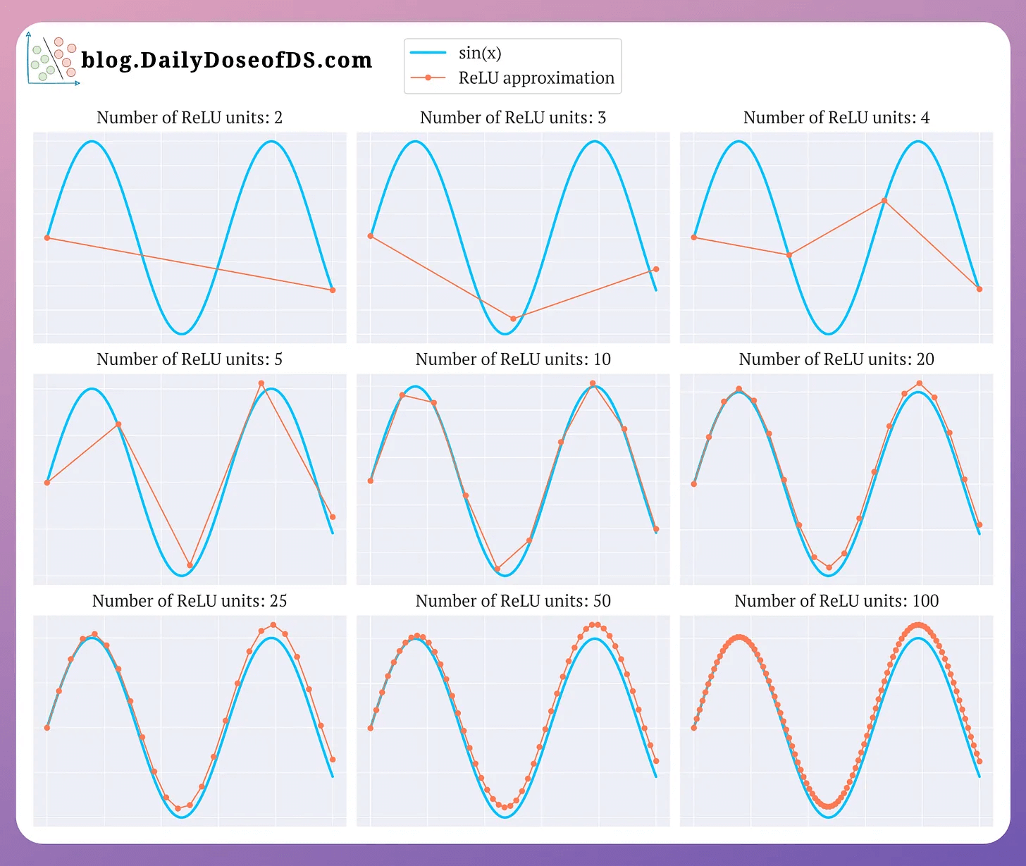 This is also evident from the image below, where as the number of ReLU units increases, the approximation also becomes better and at 100 ReLU units, the approximation appears entirely non-linear: