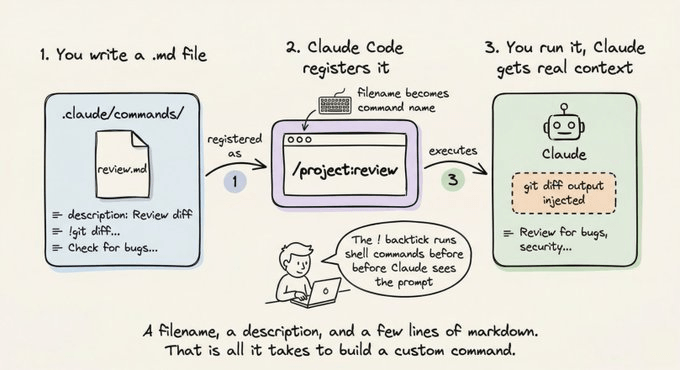 Give specific, actionable feedback per file.Now run /project:review in Claude Code and it automatically injects the real git diff into the prompt before Claude sees it. The ! backtick syntax runs shell commands and embeds the output. That’s what makes these commands genuinely useful instead of just saved text.