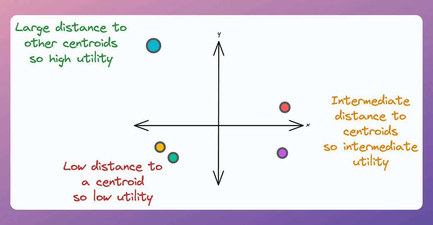 A centroid’s utility is proportional to its distance from all other centroids.