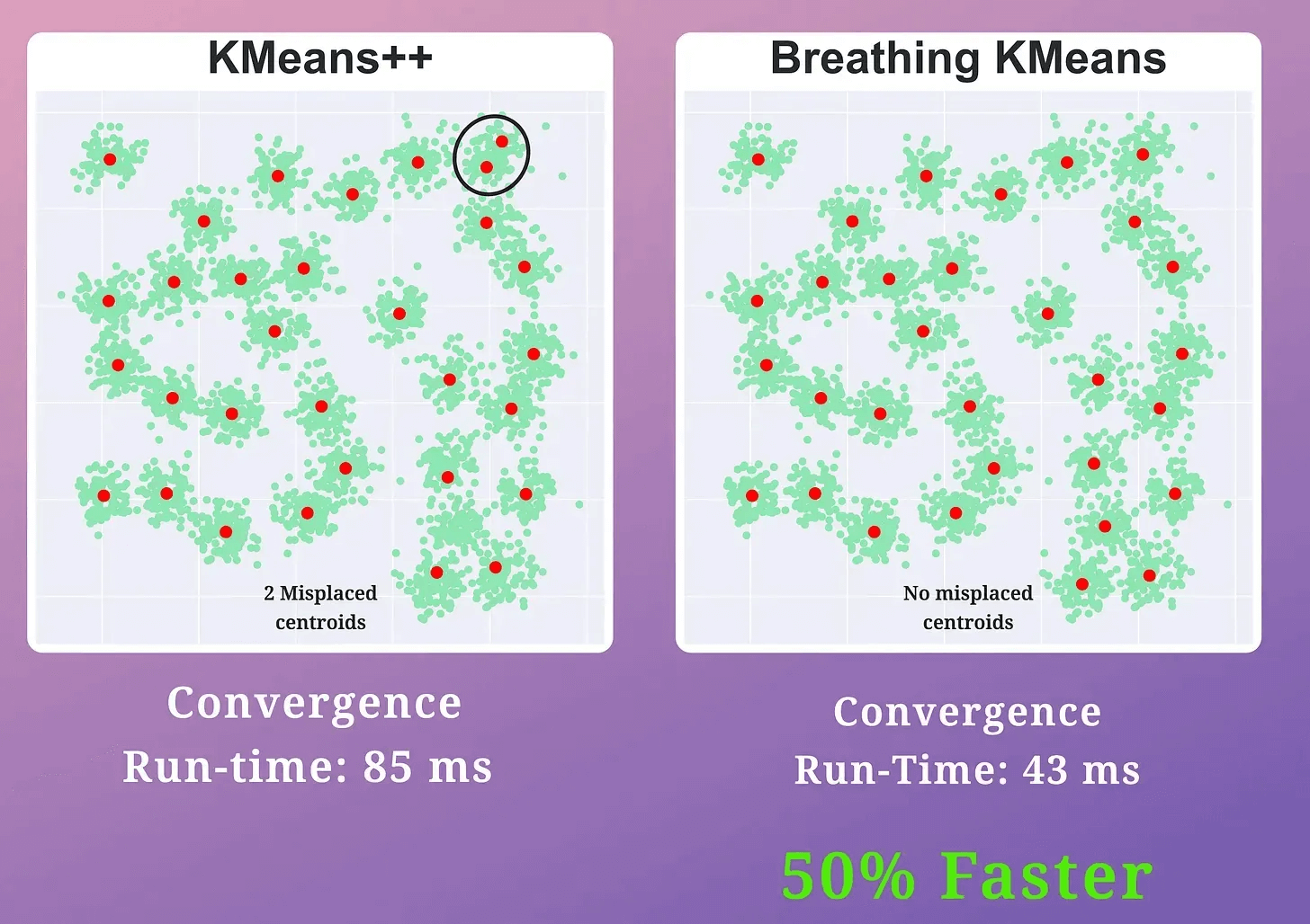 Breathing KMeans accurately clustered the data with a 50% run-time improvement.