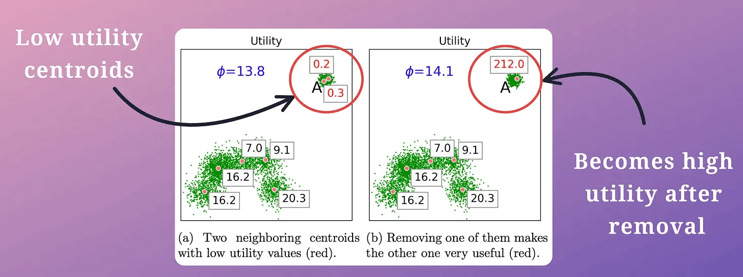Low-utility centroids are removed. This helps eliminate centroids that are likely in the same cluster.