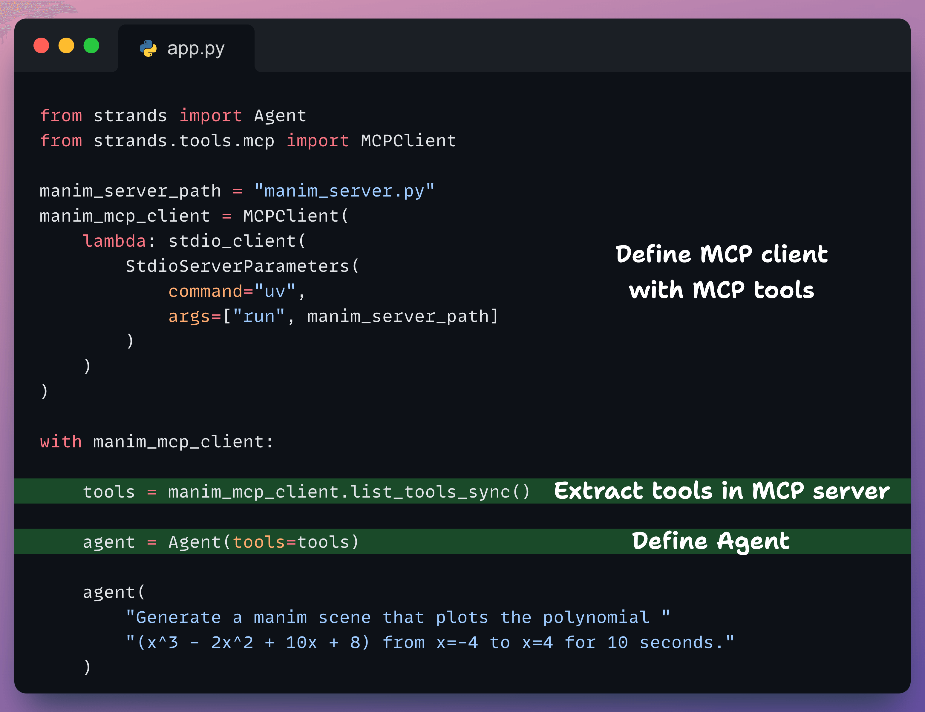 And a single natural language call that drives the entire flow. The model plans the steps, generates the Manim scene, and invokes the right tool autonomously.