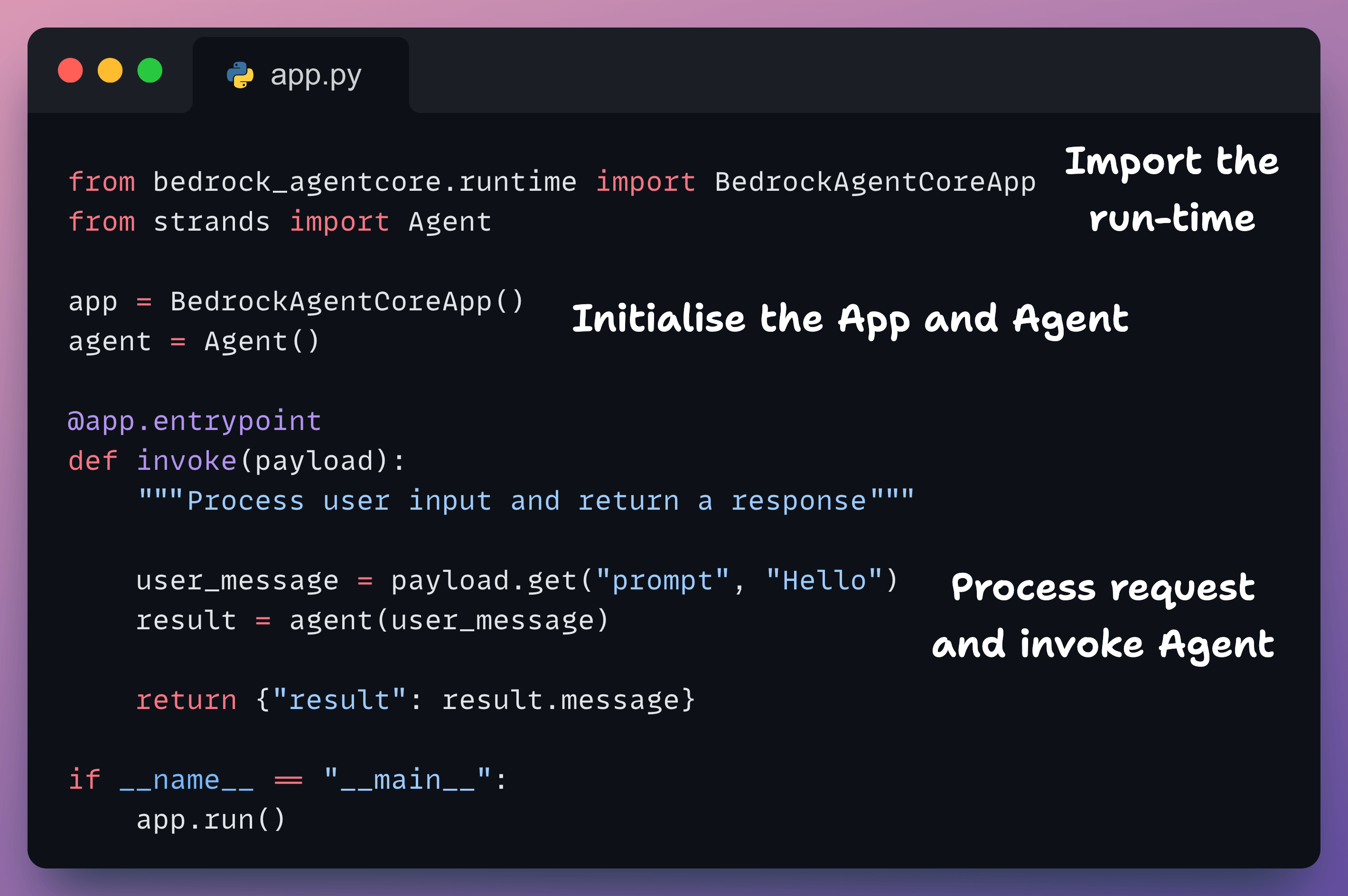 BedrockAgentCoreAppthat handles scaling, security, and the request lifecycle.Define a Strands