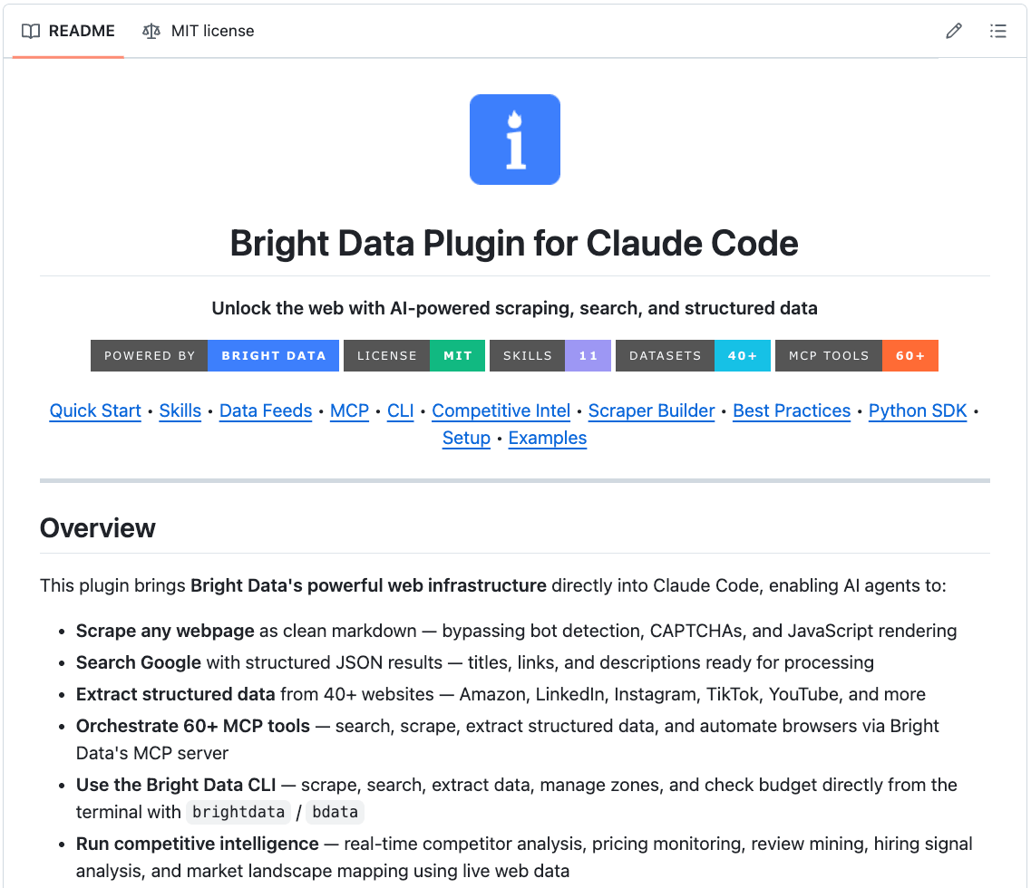 Bright Data open-sourced a skills plugin (brightdata/skills), which provides live web access directly into Claude Code, Cursor, Windsurf, and 40+ other coding agents, with automatic handling of all those access barriers.