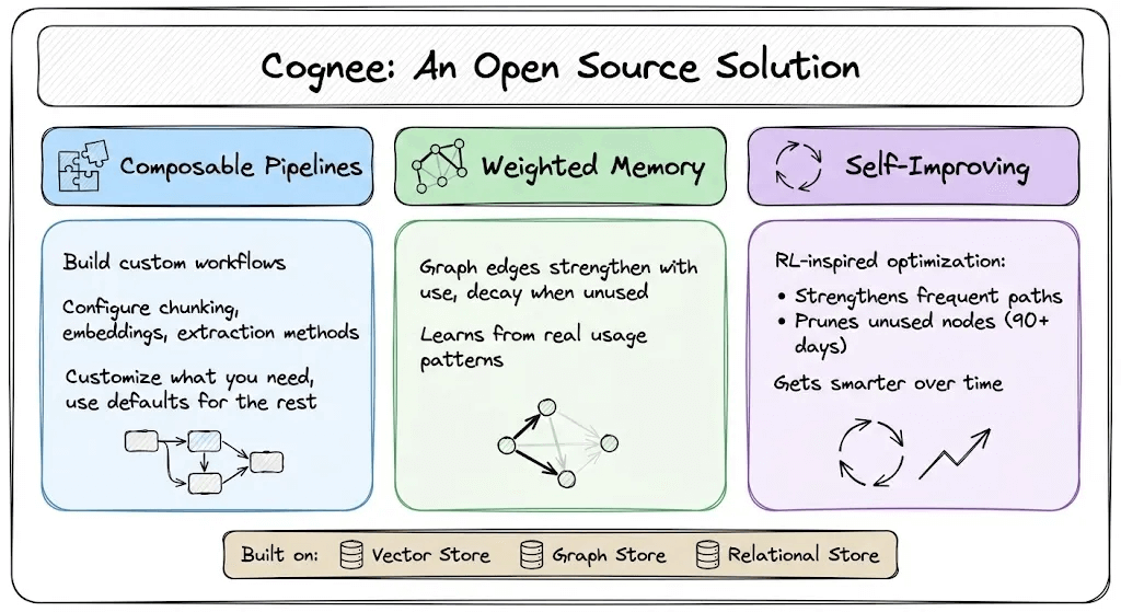 Self-improving (memify): Memory is continuously refined via RL-inspired optimization, strengthening useful paths, pruning stale nodes, and auto-tuning based on real usage.