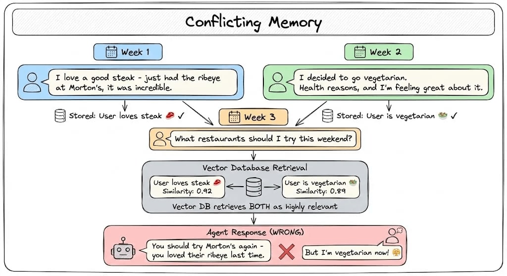 Vector databases don’t understand that “decided to go vegetarian” replaces “I love a good steak” - they just see two food-related statements and treat them as equally valid.