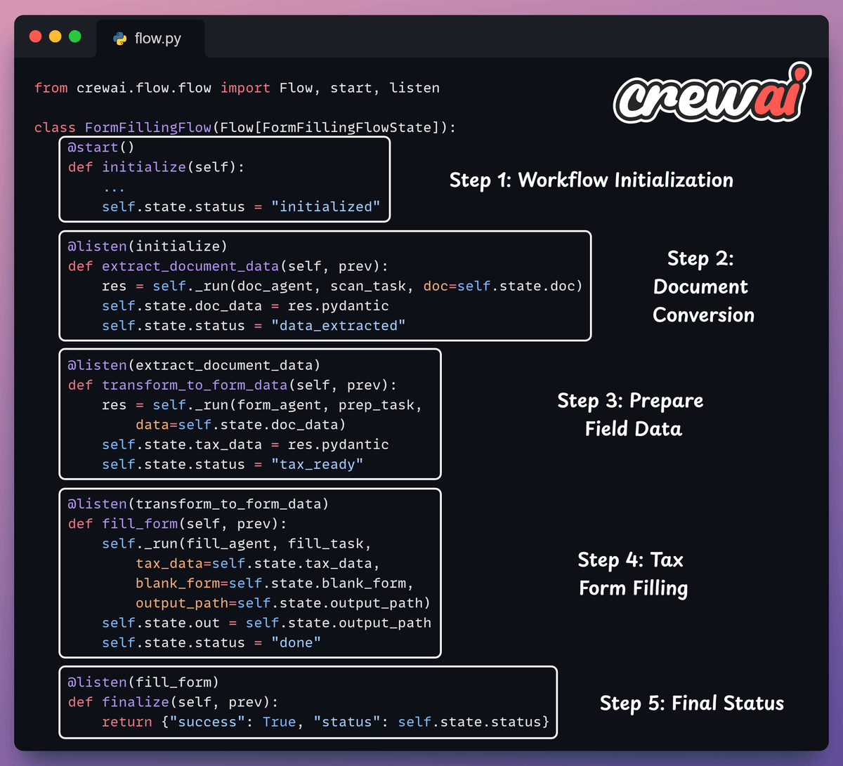 Finally, we connect all three agents within a workflow using CrewAI Flows.