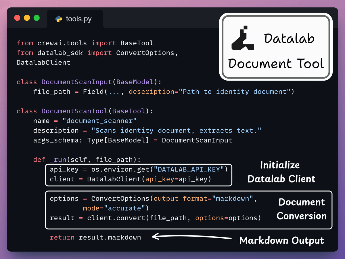 A custom tool powered by the Datalab SDK. It takes a document file path, sends it to Datalab’s Document Conversion, and returns extracted text in markdown format.
