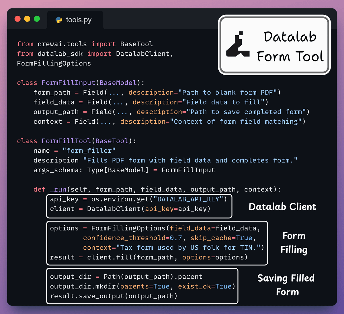 Another Datalab-powered tool processes a blank PDF form, structured field data, and an output path.