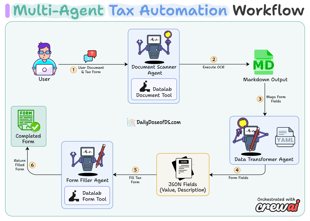 The flow consists of four steps: initialize → extract document data → prepare form data → fill the tax form.