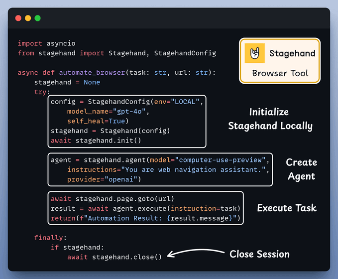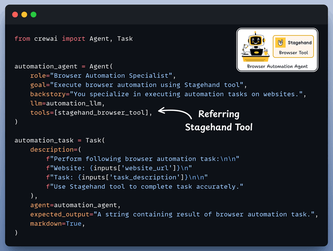 Browser Automation Agent utilizes the aforementioned Stagehand tool for autonomous browser control and plan execution.