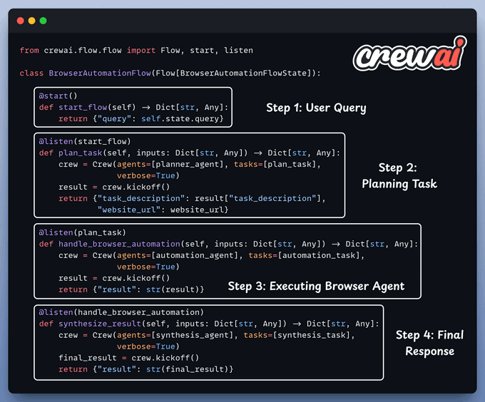 Finally, we connect our Agents within a workflow using CrewAI Flows.