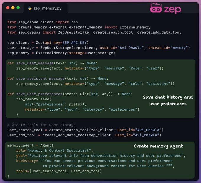 Zep acts as the core memory layer of our workflow. It creates temporal knowledge graphs to organize and retrieve context for each interaction.